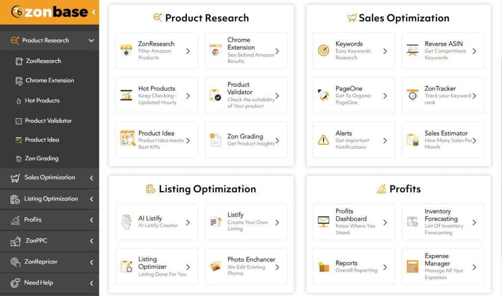 ZonBase offers 20+ Amazon seller tools to help you automate your business processes. The software offers effective tools for product research, keyword research, and listing optimization. It also offers a sales estimator and profits tool, as well as done-for-you services that allow you to outsource your listing optimization and PPC automation tasks to a professional team.