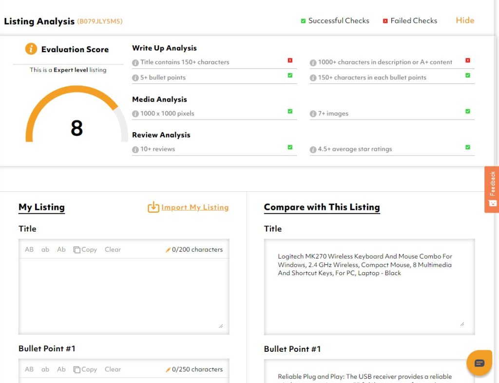 - Afterwards, the tool will assign an evaluation score to your competitors’ listing. And you can scroll down a little to see a detailed breakdown of your competitors’ listing