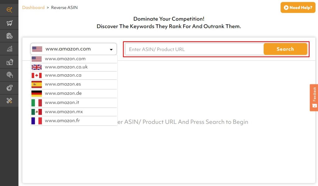 - Copy your product ASIN/URL from Amazon. Then, paste it into the search bar in the Reverse ASIN tool and click ‘search’. A pop-up for your competitor ASINs will appear.