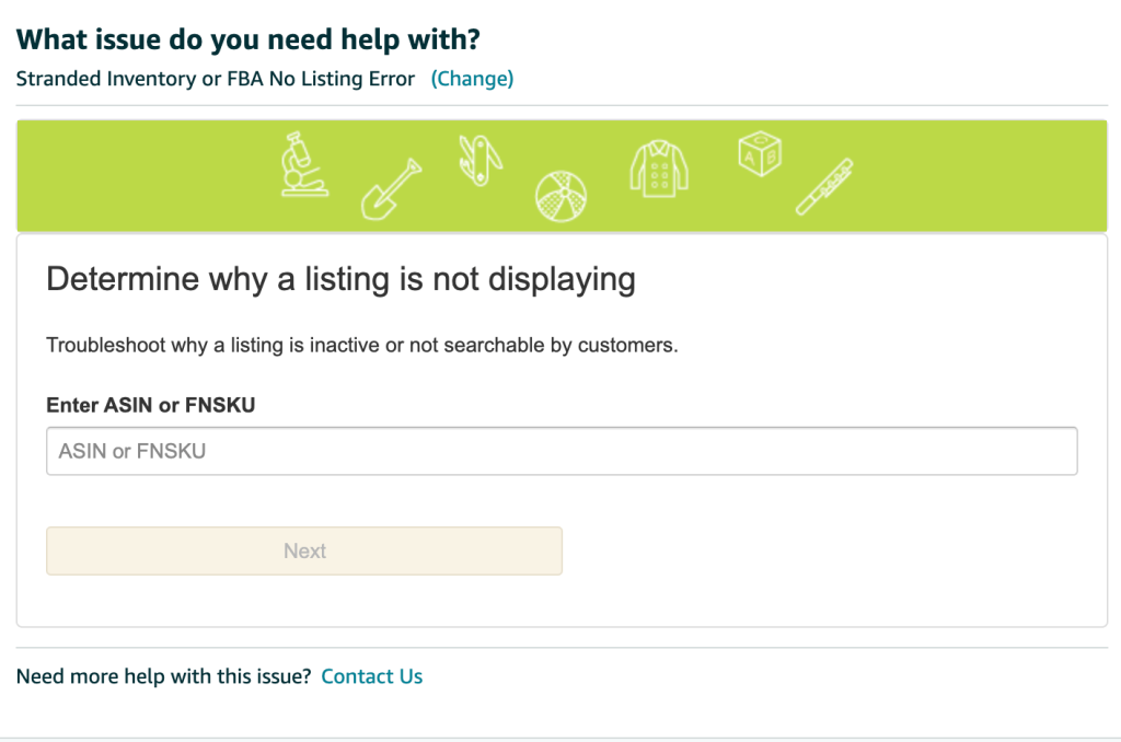 - Under the ‘What service can we help you with?’, select ‘Selling on Amazon’, then ‘Fulfillment by Amazon, then ‘Investigate Other FBA Issues’, then ‘Stranded Inventory or FBA No Listing Error’.