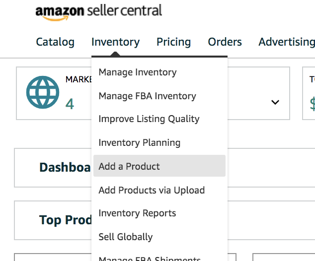- First, go to the inventory tab in your seller central dashboard, then click on “Add a product”