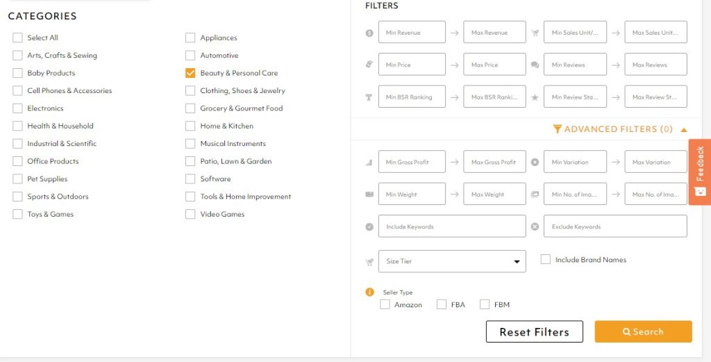 Filters such as price, reviews, monthly unit sales, and monthly revenue will make it easier for you to laser-focus on your chosen category. It also provides advanced filters that allow you to include or exclude keywords, view product ratings, and even calculate BSR (bestseller rank) for each product option.