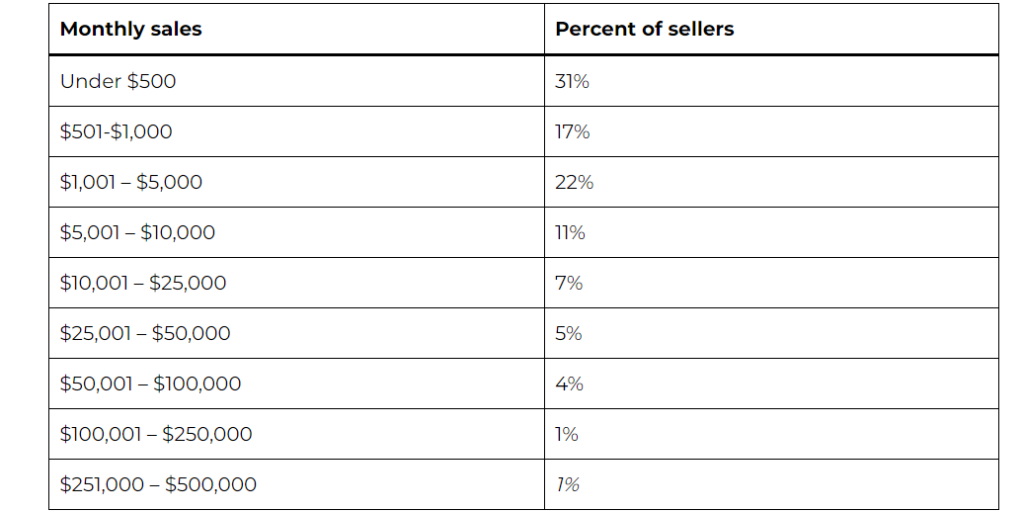 – 40% of Amazon sellers generate sales ranging from $1,000 to $25,000 per month.