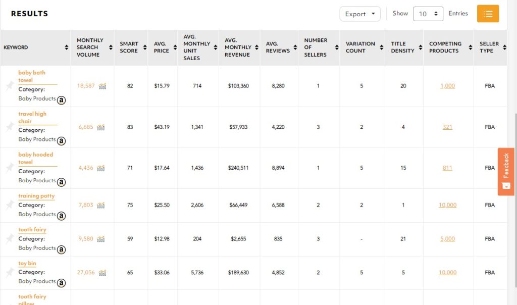 - Click ‘Search’. The tool will generate a list of relevant keywords with high search volume. It will also come up with a smart score that indicates the relevance of the keyword. The tool also provides a seasonality indicator that shows the popularity of the product. You will find this metric useful if you’re considering selling a seasonal product.