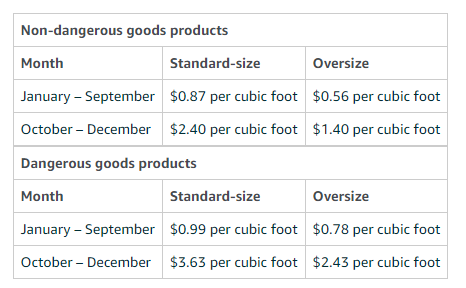 The amount you have to pay will vary depending on the size and category of the item you are selling. Storage fees can also go up during peak shopping seasons such as Black Friday, Christmas, and Cyber Monday.